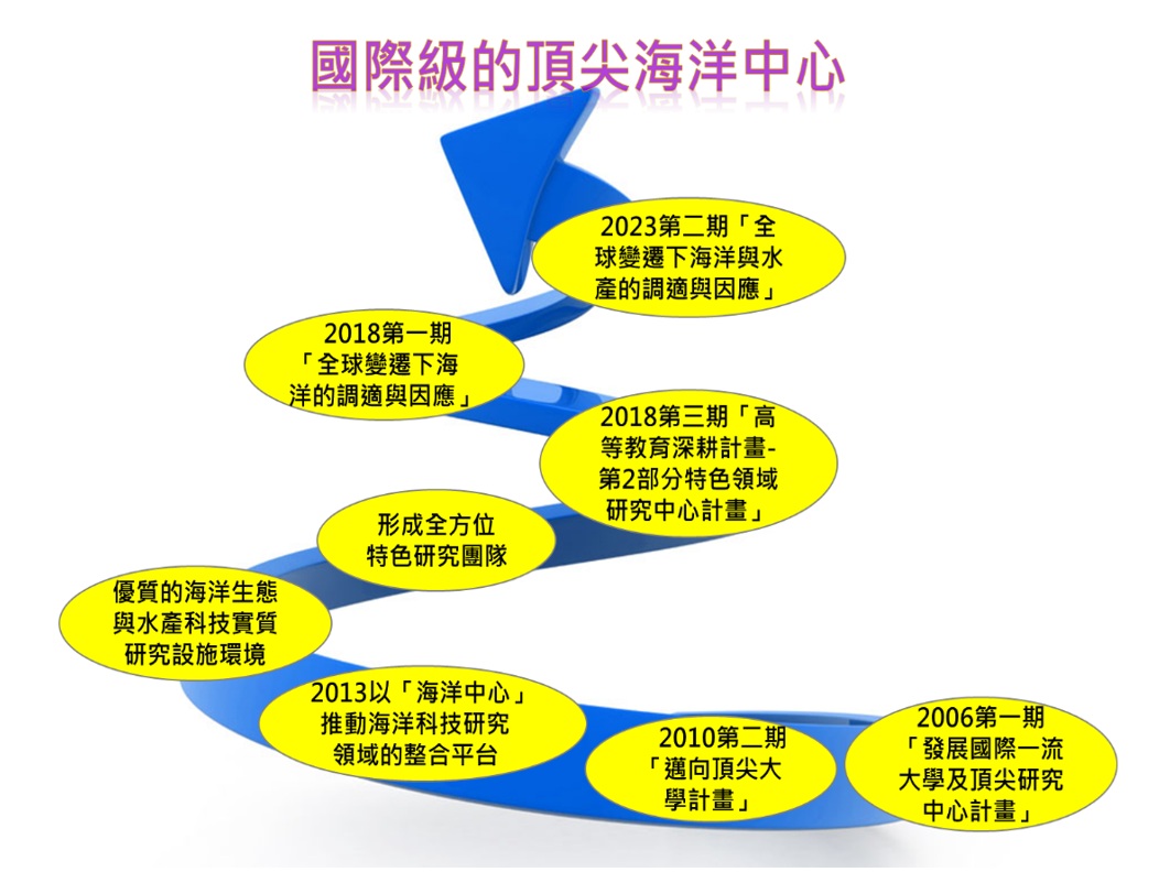 第一階段:在教育部第一期「發展國際一流大學及頂尖研究中心計畫」的核准補助下,於2006年8月在本校成立了編制內的一級研究單位,具實體空間及具專案人員的「水產生物科技頂尖研究中心」,並設立全國共享核心實驗室平台與優質研究環境,推動重點研究領域基礎研究,同時帶動我國在海洋科學領域的發展,獲得卓著成效。