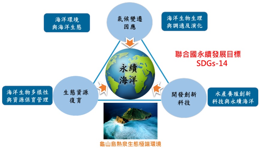 目前,海洋中心整合校內外資源,建構推動海洋生物科技研究領域所需之軟硬體設施,進而籌組跨領域研究團隊,推動主題計畫「全球變遷下海洋的調適與因應」,主要研究議題有四項,分別為:「海洋環境與海洋生態」、「海洋生物多樣性與資源保育管理」、「海洋生物生理與調適及演化」及「水產養殖創新科技與永續海洋」。研究領域是屬跨領域,以海洋科學與水產生物科技為核心,包括分子生物、細胞生物、海洋化學、海洋生物多樣性、海洋生物個體、海洋環境生態、海洋資源、海洋族群動態、系統演化等層次。離海洋大學不遠的宜蘭縣龜山島,有世界難得的海底熱泉生態,本中心特別以龜山島熱泉生物作為極端環境研究模式,串連本中心的四個研究議題,藉由瞭解極端環境下的海洋生物,如何因應與適應環境的快速變化,及海洋酸化對海洋生物及海洋生態系的衝擊,研究成果可幫助經濟性水產養殖物種適應目前加劇的氣候變化,藉以協助本校達成卓越教學與特色研究世界級「海洋頂尖大學」的願景。海洋大學在海洋科技領域(Oceanography, Marine and Freshwater Biology, Fisheries)論文成果已居全國第一名,並在東海的海洋生態、淺海熱泉極端環境生態、甲殼類生物多樣性、硬骨魚類及珊瑚生殖生理學等的研究領域具國際重要地位。海洋中心亦延攬有不少國際級講座大師,包括廖一久院士、教育部玉山學者法國國家科學研究院Dr. Sylvie Dufour等。